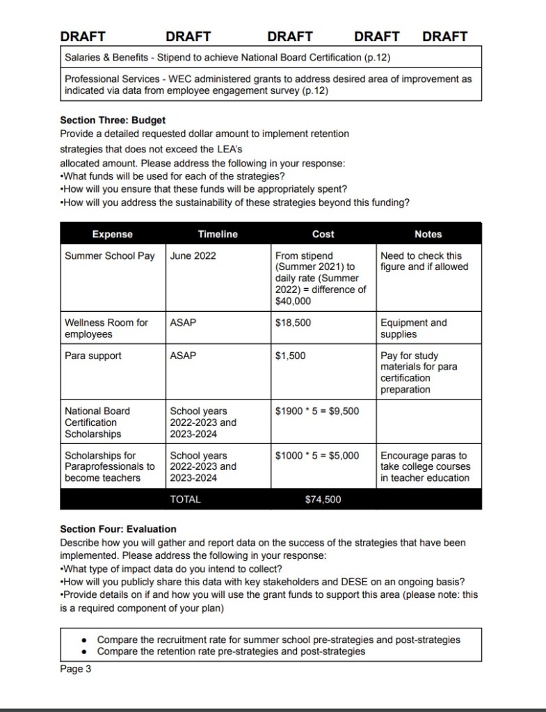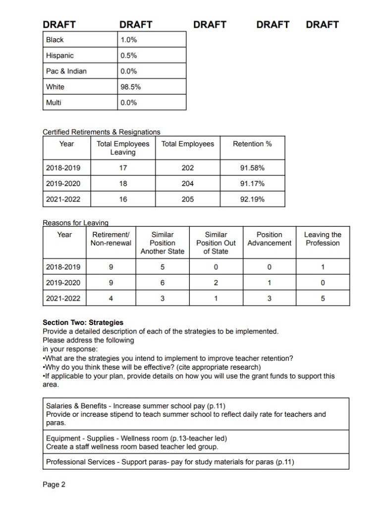 The third portion was a MO DESE grant called the Teacher Recruitment and Retention Grant. Dr. Nelson stated the amount of money provided by this grant is established by district size, demographics (Nelson said this was based on free lunch numbers. It seems like it’s racial demographics if you look at the form. Maybe that’s what she meant.), and priority set by MO DESE.