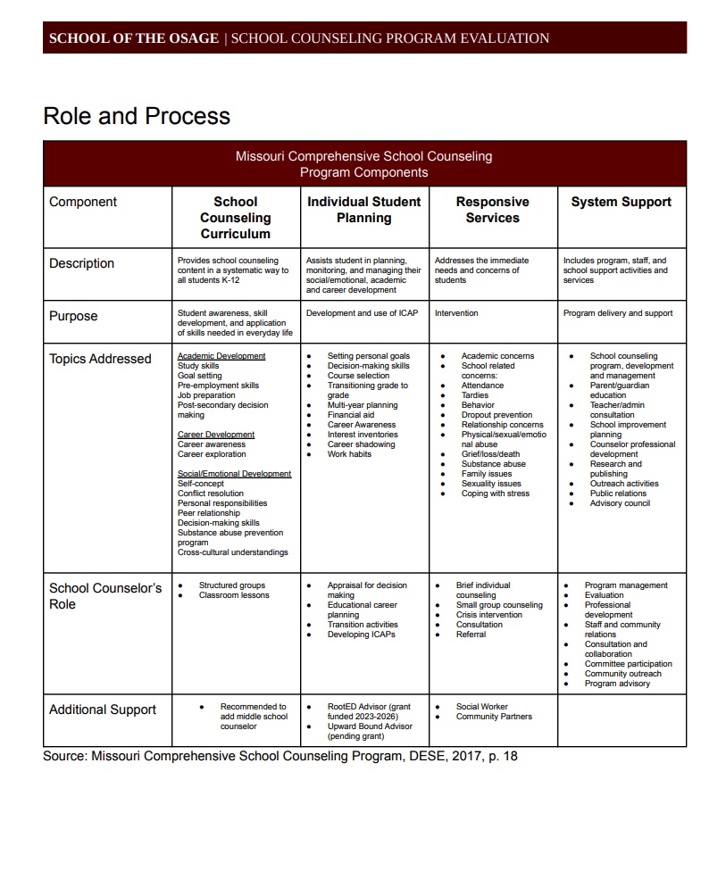 In 2016, the Missouri legislature changed guidance counselors to counselors. They are now responsible for School Counseling Curriculum, Individual Student Planning, Responsive Services, and System Support.