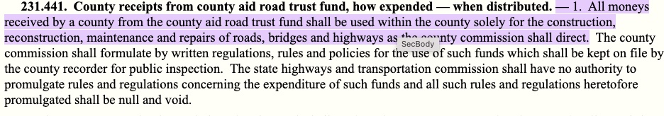 Presiding Commissioner-Elect Ike Skelton read from Missouri statute that “all moneys received by a county from the county aid road trust fund shall be used within the county solely for the construction, reconstruction, maintenance, and repairs of roads, bridges, and highways as the county commission shall direct.”