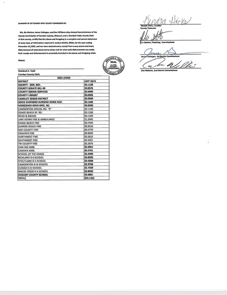 The Treasurer has prepared the 2022 Financial Statement. It needs to be approved by the Commission and forwarded to the County Clerk’s Office so it can be sent to the state government and published in the newspaper.