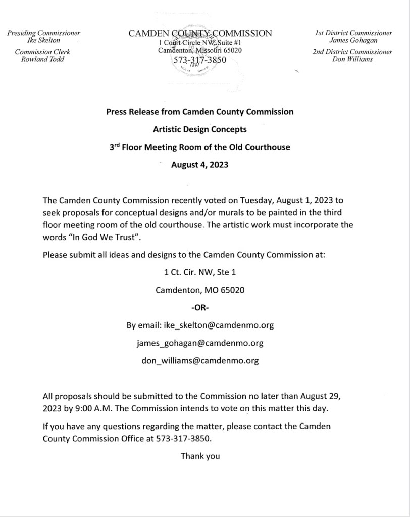 I’ve also been asked to post this advertisement for any artists who might be interested in presenting their ideas to paint a mural in the Commission Meeting Room with “In God We Trust” as the theme. Good luck and make sure you include plenty of possums!: