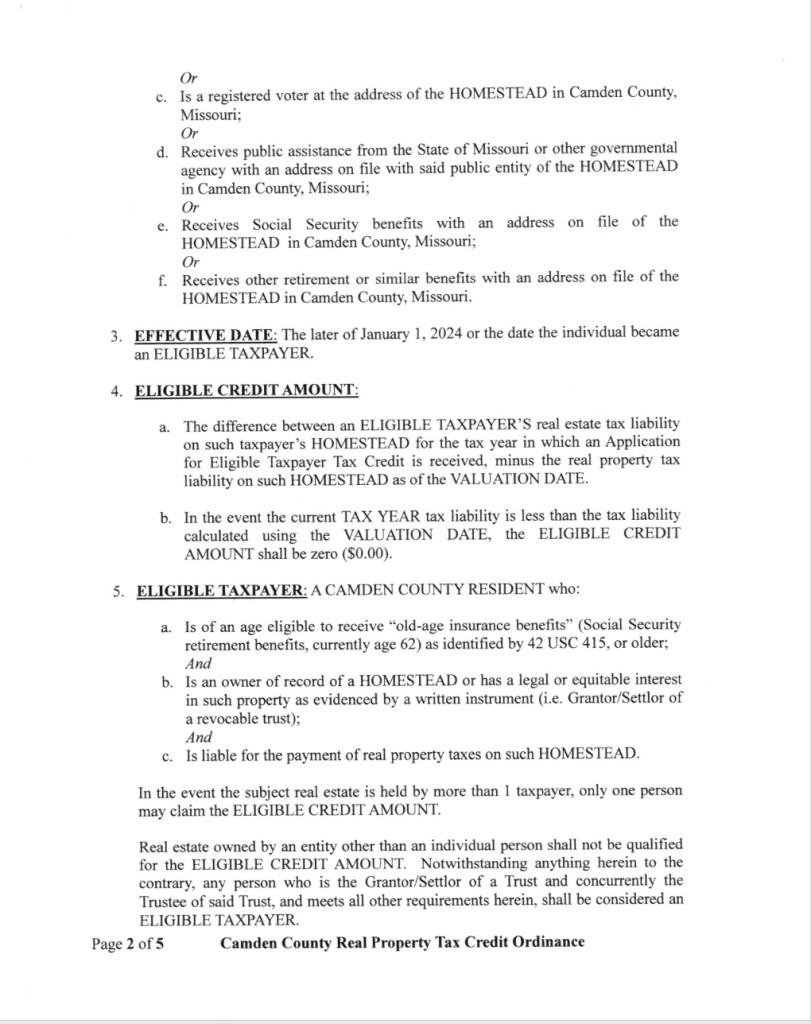 Presiding Commissioner Skelton stated that the ordinance would make Camden County the first Missouri county to enact SB190. (It turned out that Greene County might have passed one also, but their ordinance didn’t give the tax credit to teachers or other individuals who aren’t eligible for Social Security.)