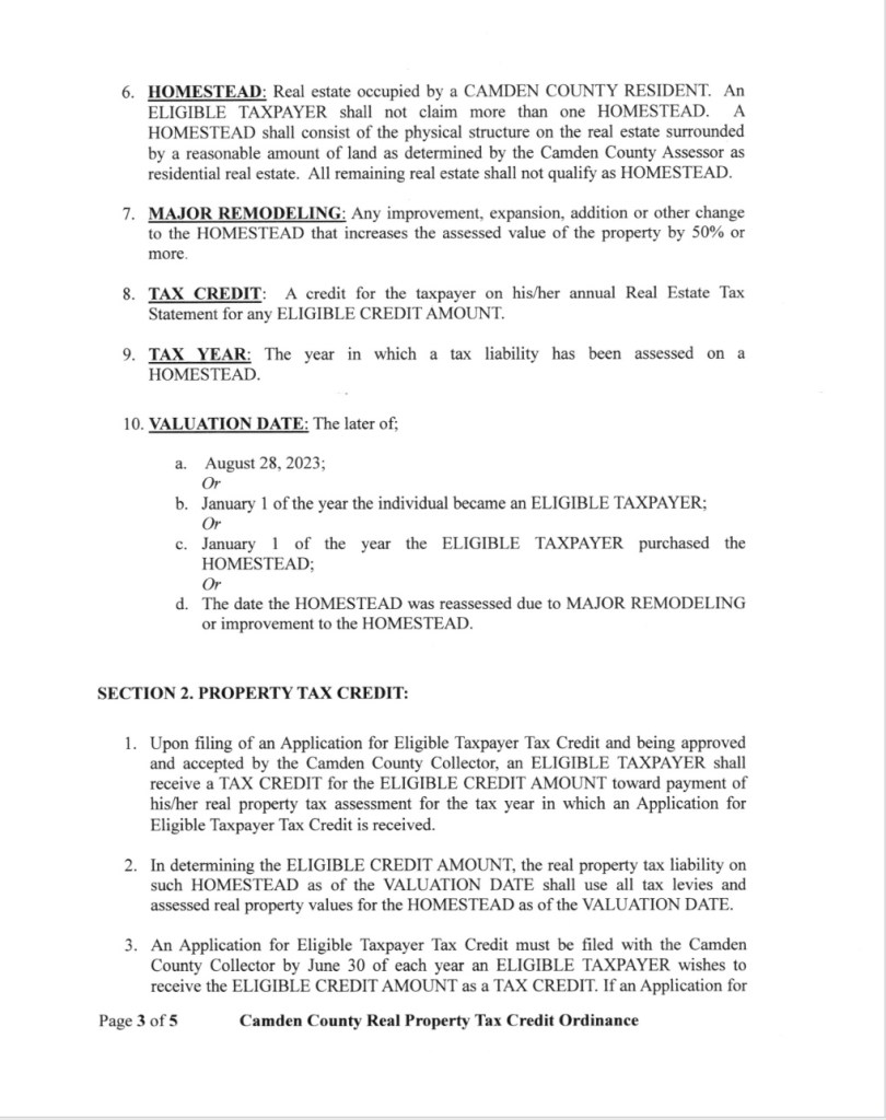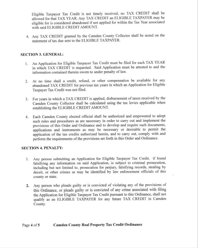 Taxpayers will have to apply for this tax credit with Camden County by the 30th of June every year. The first time people apply, there will be more paperwork required to establish the tax credit. In following years, the process should be easier to simply renew the tax credit with the county.