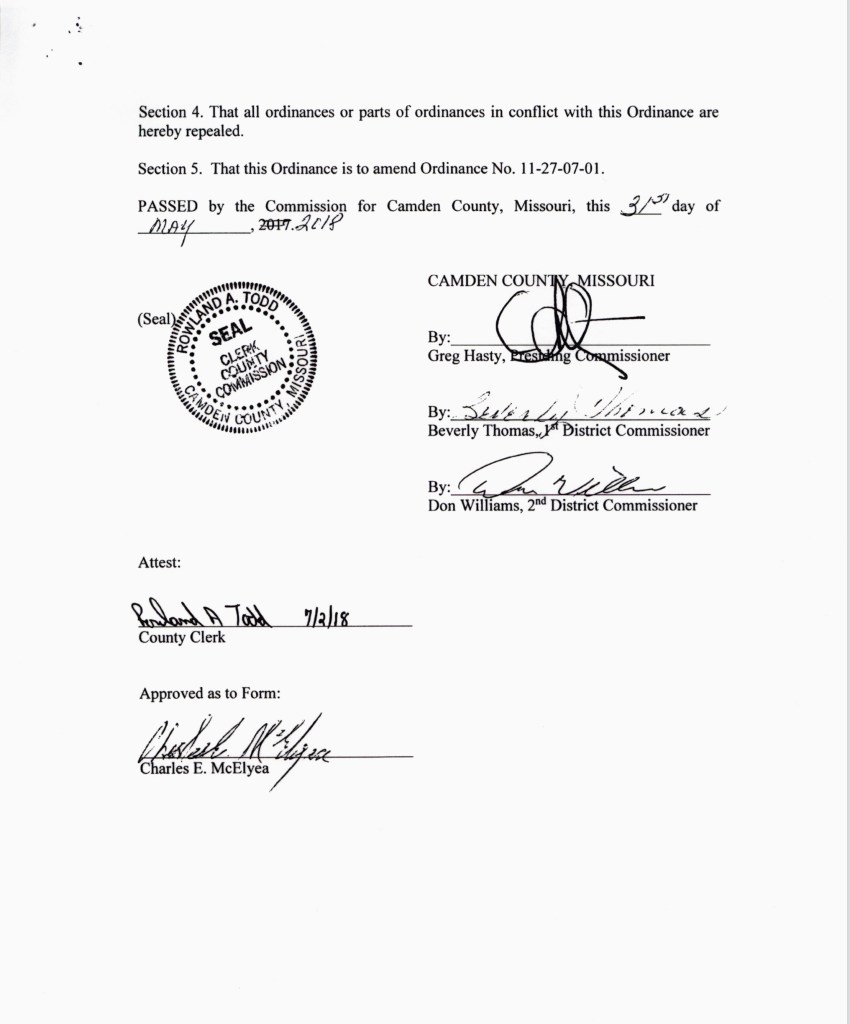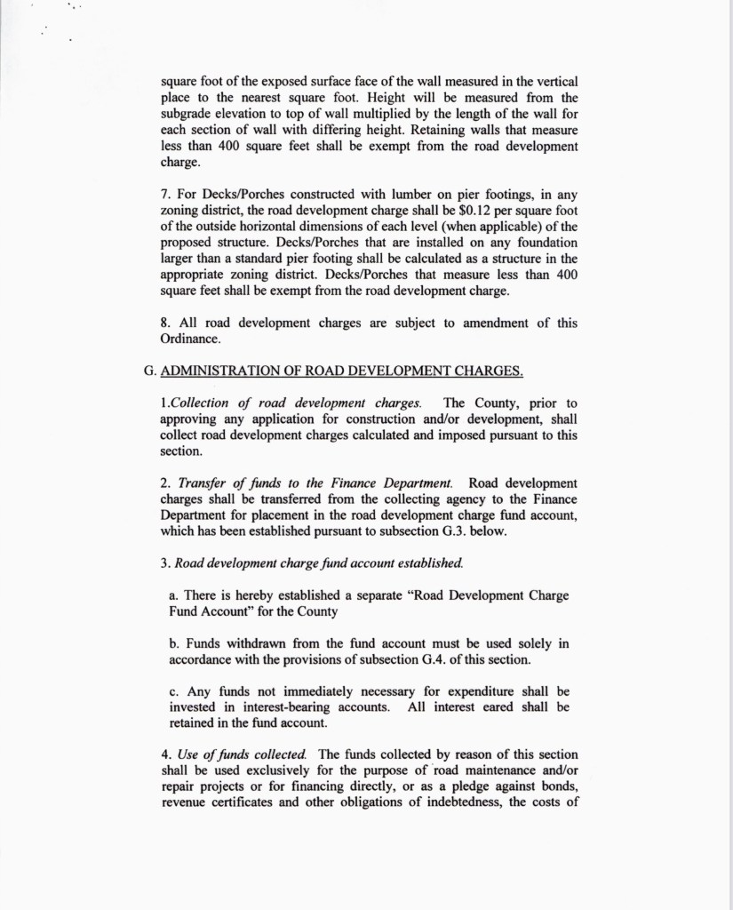 I have attached a copy of the Camden County Ordinance that amended the established Road Development Charge (road impact fee). It was signed on May 31, 2018, by Commissioners Greg Hasty, Beverly Thomas, and Don Williams, and is the current ordinance regulating the fees. It’s worth a read.
