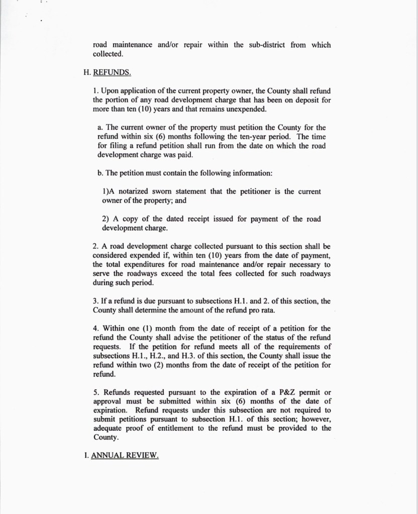 Schuman also mentioned that the current ordinance stated that people who paid impact fees can get their impact fees reimbursed if no repairs were performed on the impacted roads within 7 years of payment. This information is not listed anywhere on the Planning and Zoning permit.