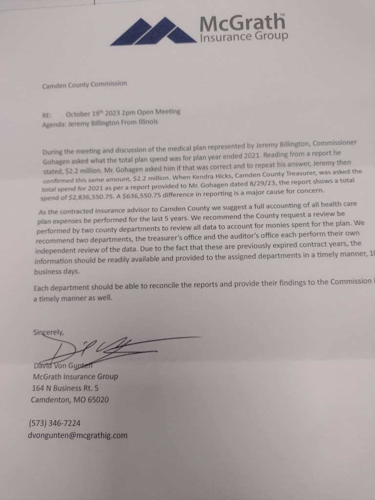 Commissioner Gohagan explained that he had reviewed some of the medical insurance financial numbers and decided to turn that information over to McGrath for them to review. Commissioner Gohagan read a letter he subsequently received from McGrath, the county’s insurance advisor. It was addressed to the Commission from David Von Gunten of the McGrath Insurance Group. The letter referenced an October 19, 2023 Open Meeting.