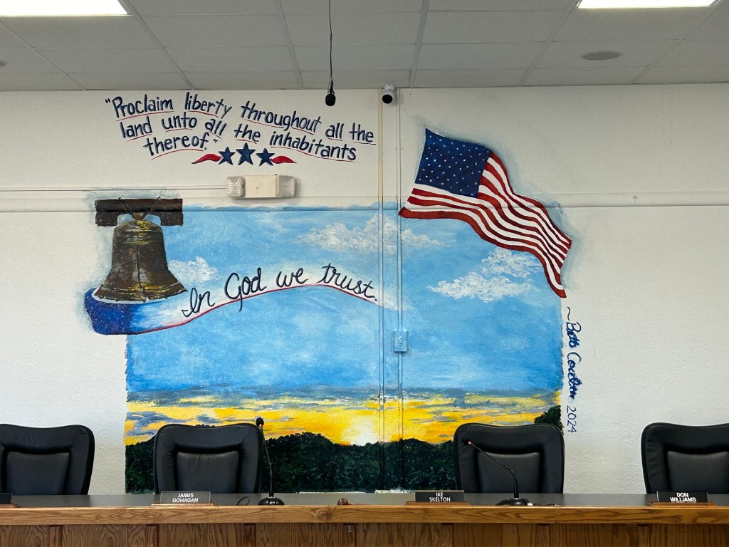 The Commission’s mural on the wall behind the Commission table had been completed and was on display.