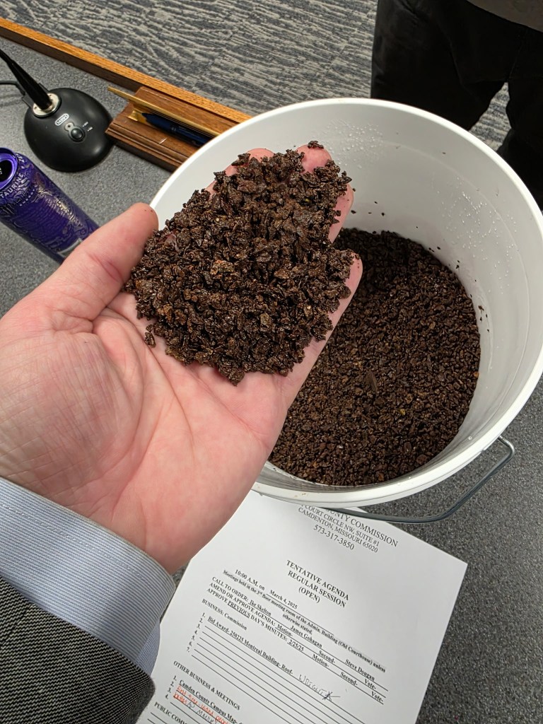 Brost brought a bucket of the material to show the chip seal material to the commissioners. Since this is Camden County, the commissioners did the appropriate thing when someone brings you an unlabelled white bucket at a meeting.