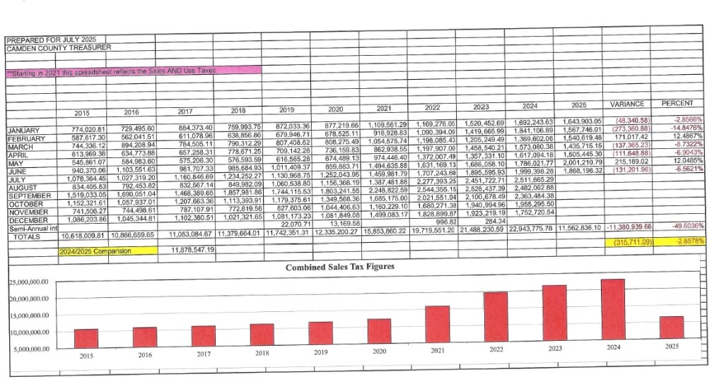 Commissioner Gohagan answered that it was a YTD comparison to last year’s revenue. The Treasurer’s numbers showed the total sales tax revenue was $315,000 less than 2024 YTD.