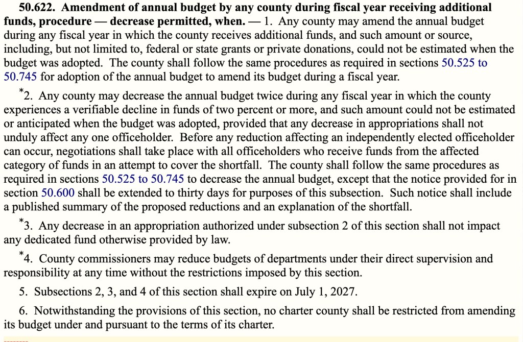 Auditor Laughlin explained that if the county re-opens its budget, it would have to be open for 30 days and budget cut would have to be “across the board.” This was dictated by RSMo 50.622. Laughlin clarified that these restrictions did not apply to departments that reported directly to the Commission.