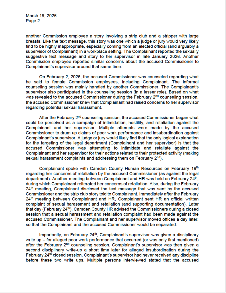 My assessment of the investigation is that the comments and actions of Commissioner Dougan were inappropriate and unprofessional, but the most disturbing aspect of what transpired are the efforts Dougan allegedly took to retaliate against the complainant and her supervisor. When you are a boss, there is an unequal power relationship that exists between you and your employees that makes retaliation much more significant. Frankly, as long as Commissioner Dougan remains in office, he puts Camden County at substantial risk for a hostile workplace lawsuit.