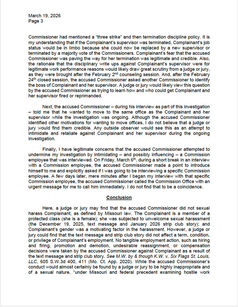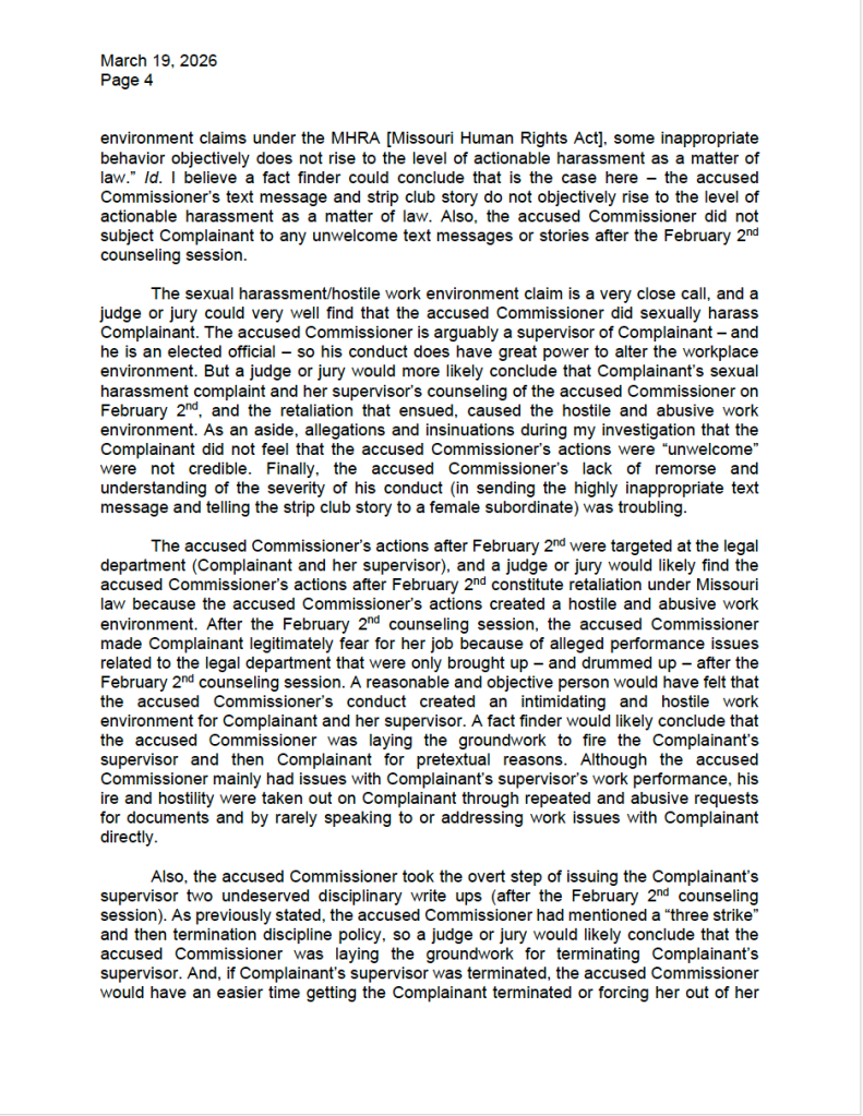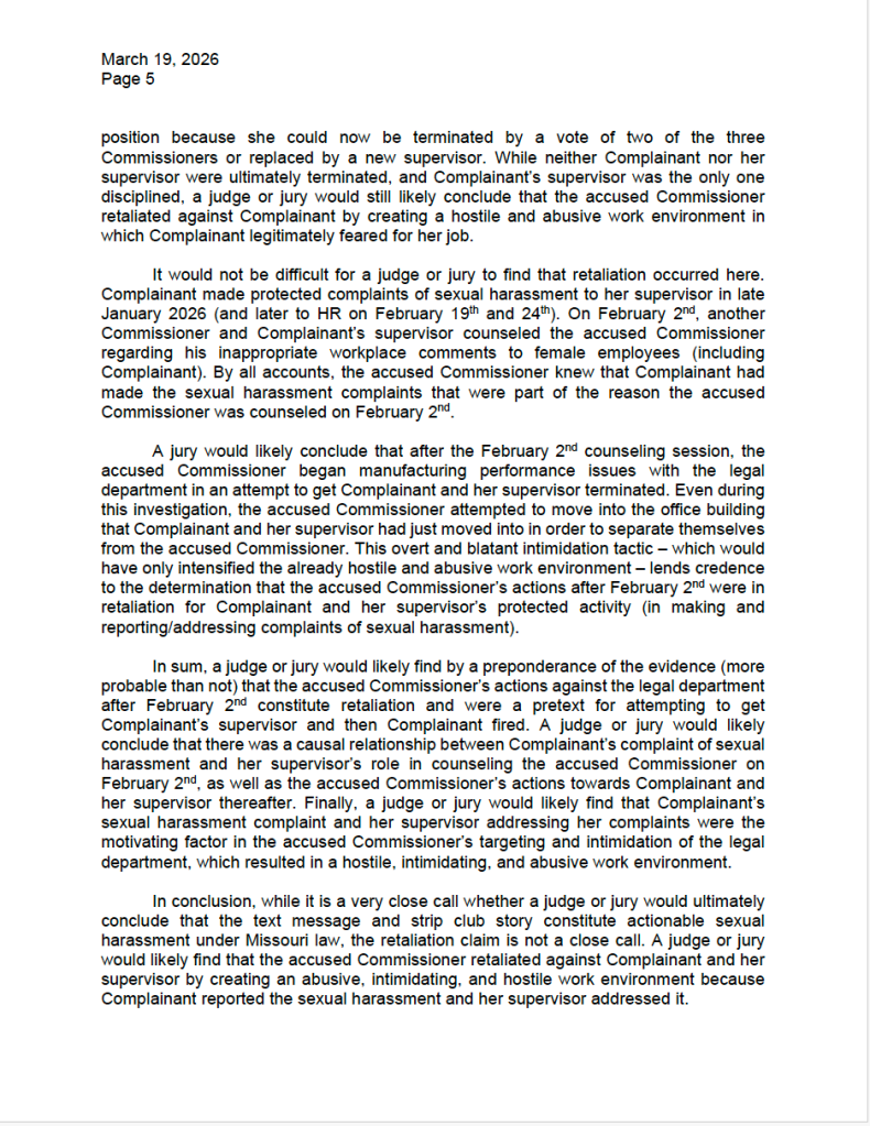 In conclusion, while it is a very close call whether a judge or jury would ultimately conclude that the text message and strip club story constitute actionable sexual harassment under Missouri law, the retaliation claim is not a close call. A judge or jury would likely find that the accused Commissioner retaliated against Complainant and her supervisor by creating an abusive, intimidating, and hostile work environment because Complainant reported the sexual harassment and her supervisor addressed it.”